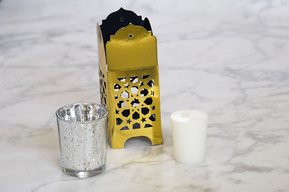 For the ladies that attended my Iftar party this year, I gifted votive candles packaged in gold paper lanterns. I love giving candles as Ramadan favors and Eid favors. Once I purchased the items, it was incredibly easy to pull together. See how I did it below!