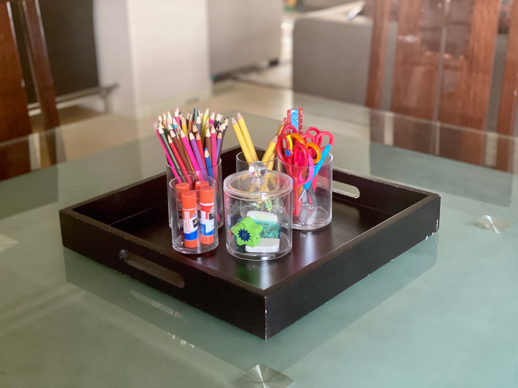 The breakfast table from morning to lunch is a functional workspace for the kids. After school, I swap out the school supplies centerpiece for the floral centerpiece.