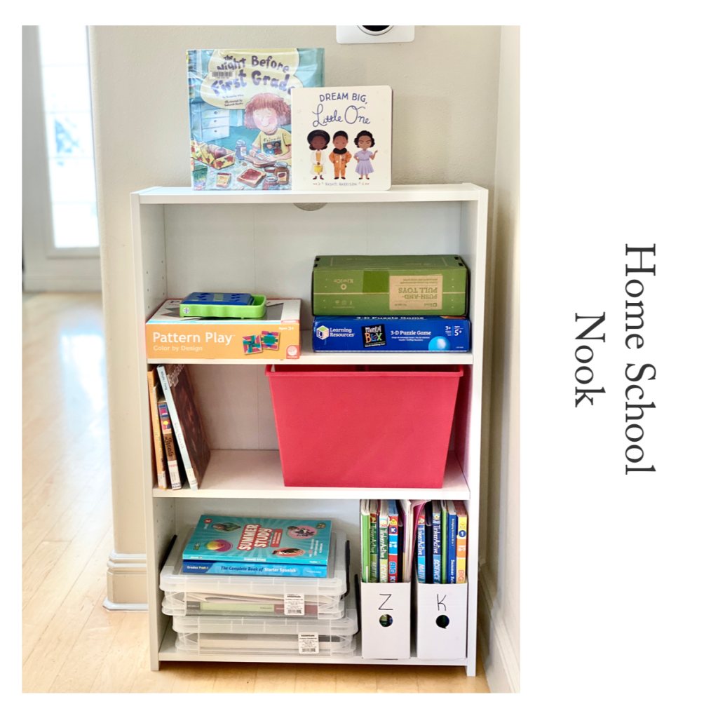Next, assessing my space. Our family decided not to convert a bedroom into a classroom, instead we decided to implement functional updates to our common space. My two boys (incoming transitional kindergartner and first grader) are a bundle of energy and need some space to spread out. This minimalist shelf serves as a hub for our school books and activities (find it in the supply list above).