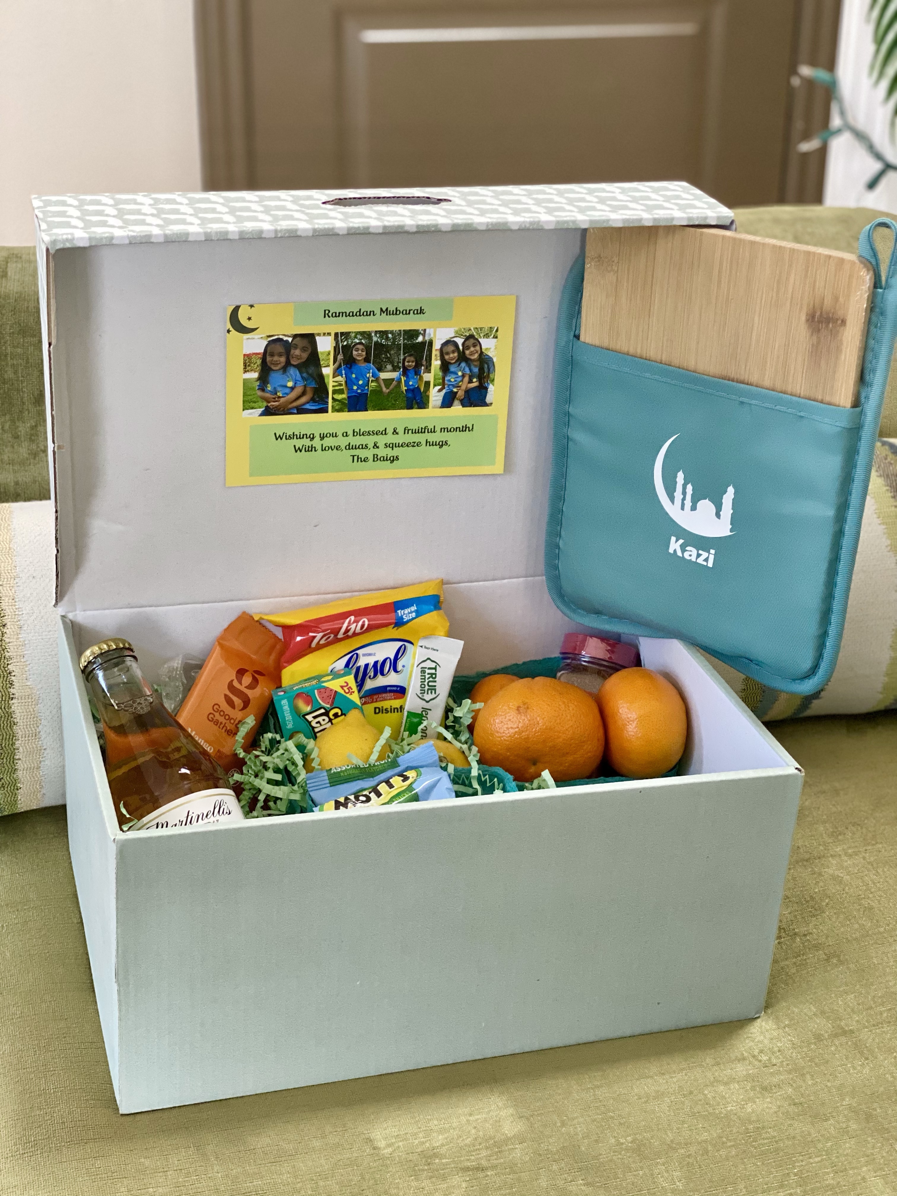 I love a good pun, so this “fruitful” themed gift box simply delighted me. The gifts inside included comfort items to keep friends healthy and a Mexican fruit cup (vasos de fruta, in Spanish) kit. The customized oven mitt and cutting board just took everything to the next level! Natasha Ahsan Baig a friend who is an amazing event designer created these fruitful boxes for Ramadan. She shared that the boxes were purchased at Ikea and the compartments were created with vented produce baskets. Nothing is more delightful than a simple concept beautifully presented.