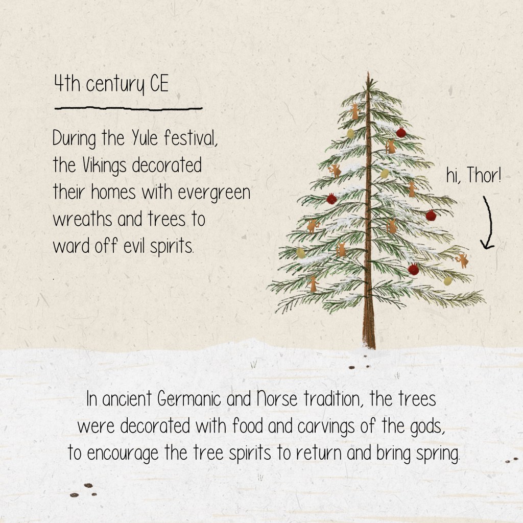 The Vikings decorated with evergreen trees and wreaths to ward off the evil spirits they associated with the winter solstice. In ancient Germanic and Norse traditions, the evergreens were decorated with small carvings of the gods and food, encouraging the tree spirits to return to bring the new spring.